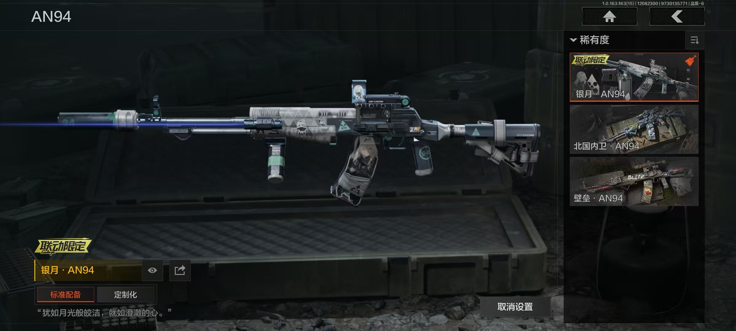 刀皮16,金枪皮16,紫枪皮79,历史最高段位:暗区传说,【角色皮肤】:使徒欧瑞恩,火绒塔莉娅,钢铁壁垒作战服,噤声者吉利服,鎏金街头套装,台风IV竞技运动服;【近战武器】:空腔战术,苍穹利爪,收割者,热能武器补牢,瀚星斩铁,寒牙手刺,旧日主宰,下弦月,涂鸦利刃,明刀绣春,冬日冰镐,急袭弯刀,瑞兔折刀,野战折刀,工兵铲,来战开山刀;【手套】:苍白之触;【突击步枪】:伦琴幻影FAL,伦琴幻影H416,蓝色咆哮H416,告丧夜曲AUG,战术大师AEK,旗帜AEK,银月AN94,钢铁真理QBZ191,浮鳞影青QBZ192,逆火玄石AKM,棱光裂变AKM,缟兵玄墨AKM,来战AKM,幻域莎绫M4A1,竞技M4A1,黑金国际M4A1,鱼跃丹青DTMDR,竞技MDR,北国内卫MDR,自喷网格H416,棱光裂变AK102,白垩游魂AK102,涂鸦AK102,火力倾泻AUG,竞技AUG,战术大师AK74N,伦琴计量AK74N,棱光裂变AK74N,来战AK74N,莫克斯AKS74U,雪山之王F2000,危崖敌影F2000,炎夏浪花AR57,竞技AR57,涂绘猎人AR57,逆火玄石ACE31,棱光裂变AC